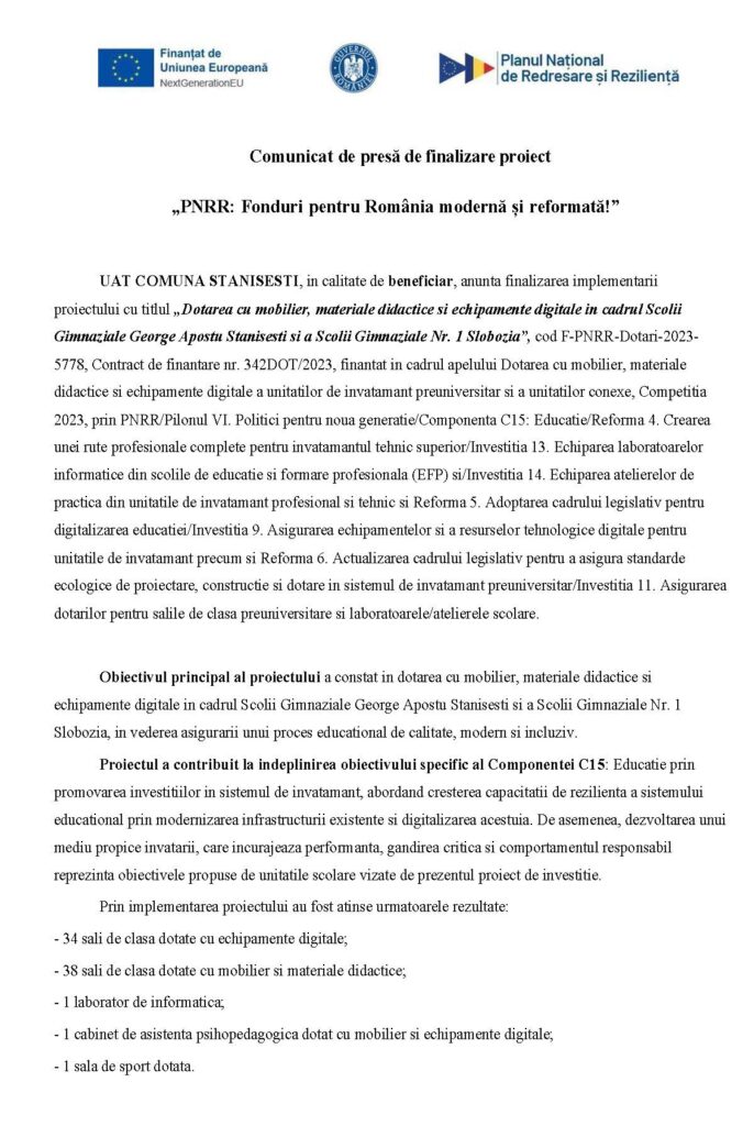 Comunicat de presa finalizare proiect PNRR: ”Fonduri pentru România modernă și reformată!”